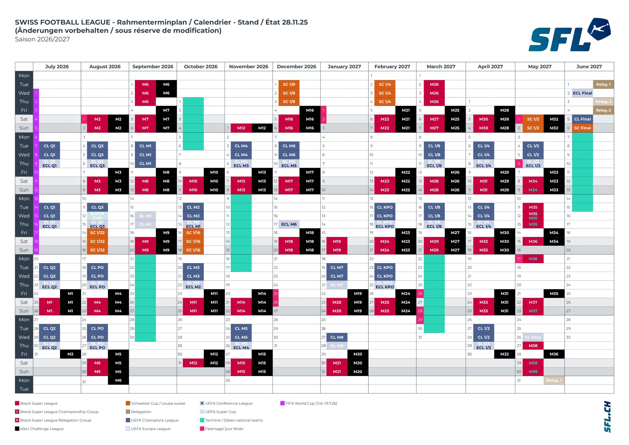 A livello di pianificazione generale, la nuova stagione inizierà nel weekend del 24–26 luglio 2026, pochi giorni dopo la finale della FIFA World Cup in programma il 19 luglio 2026 a New York. La pausa invernale durerà quattro settimane, dal 20 dicembre 2026 al 16 gennaio 2027, mentre la prima fase si concluderà domenica 25 aprile 2027 con la disputa della 33ª giornata. Successivamente il campionato entrerà nella consueta suddivisione tra Championship Group e Relegation Group, con la conclusione prevista tra il 27 e il 30 maggio 2027, in base al calendario dei due gruppi. Nella settimana successiva si terranno infine gli spareggi tra l’11ª classificata di Brack Super League e la 2ª di dieci Challenge League.